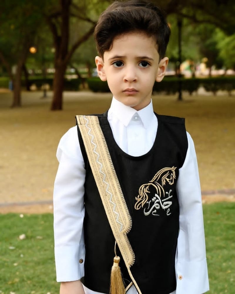 سديري البشتبشكله الانيق باللون الاسودمتوفر مقاسات جاهزه حسب العمرمن سنه الى12سنهمع امكانيه اضافه الاسم عليه حسب طلبك**تنبيه**المقاسات تناسب الاجسام النحيفه والمتوسطهبحاله جسم الطفل متين يرجى اختيار المقاس المناسب بالانش من دليل القياسات