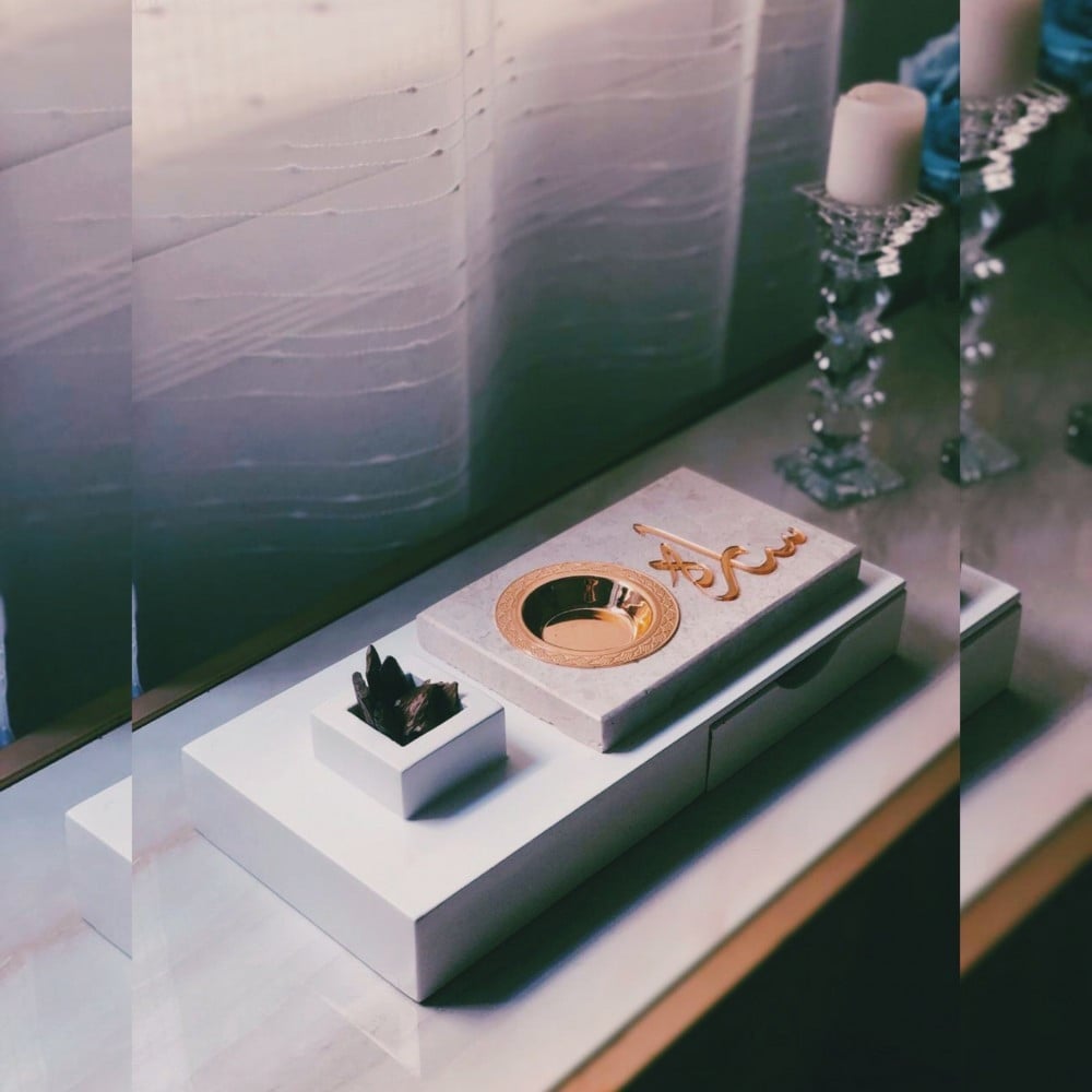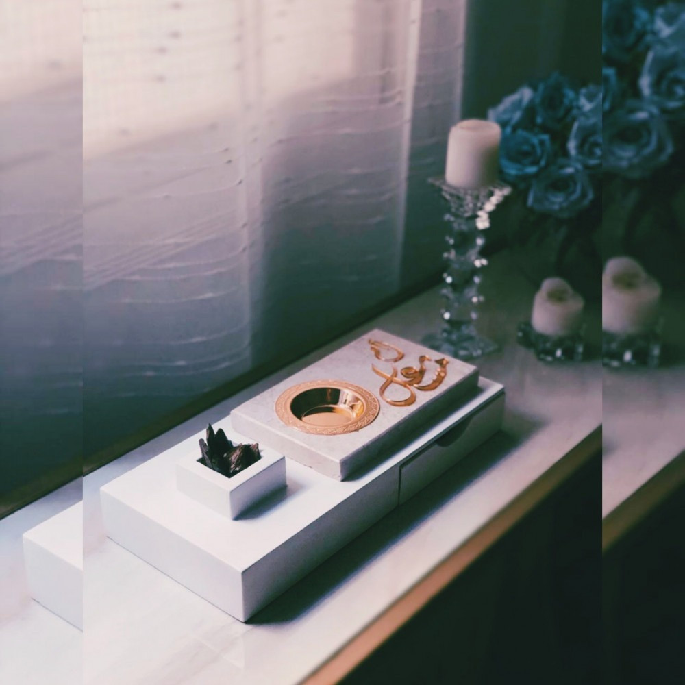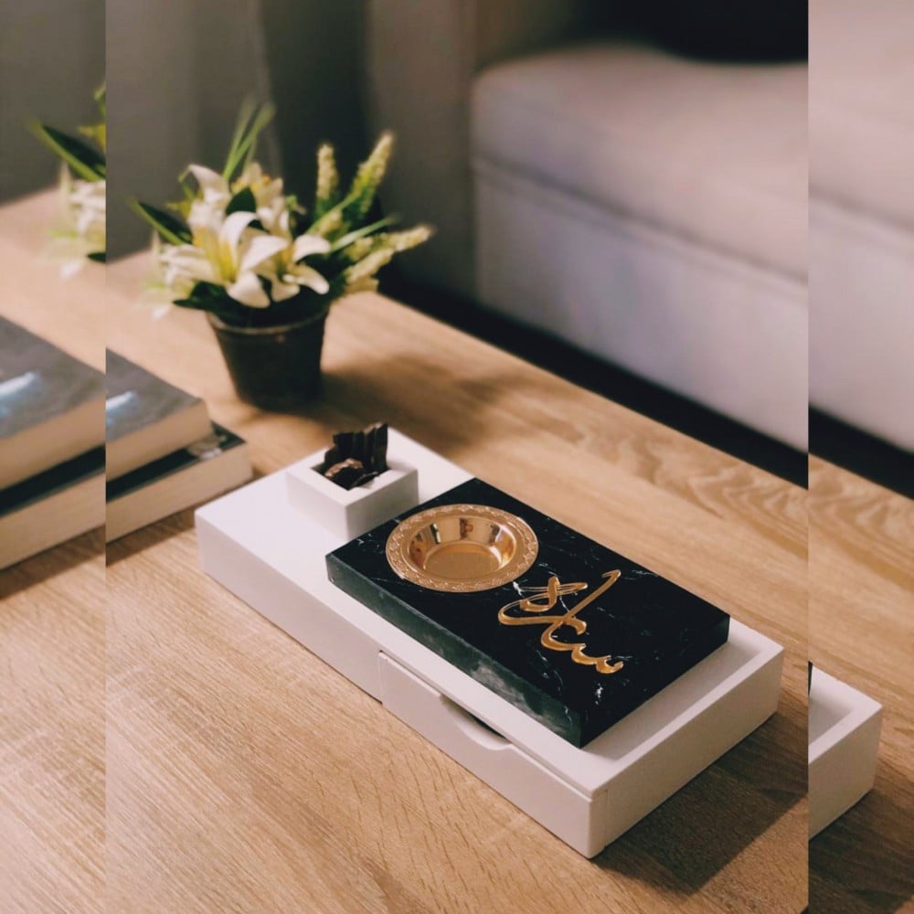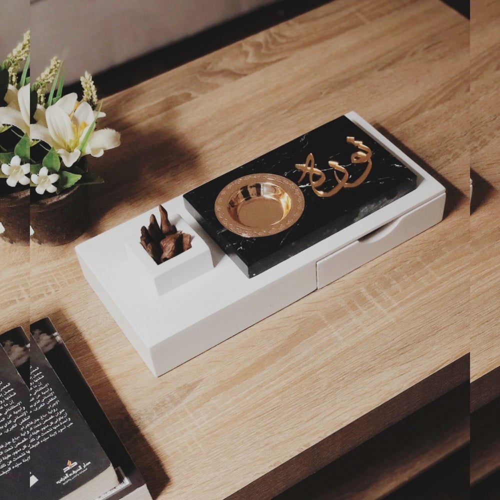 مبخرة رخام مصنوعة من أفضل انواع الرخام مع صندوق خشبي بتصميم انيق مع مربع لوضع البخور و درج صغير.