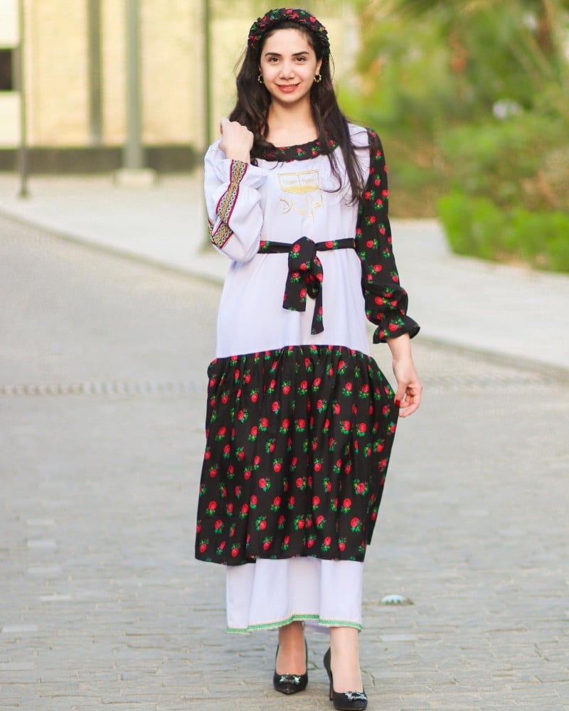 الجلابية عباره عن موديل بشكل حضري. مدموج بقماش الشالكي الشعبي التراثي ممزوج بنقوش السدو للحضاره العريقه والاصليه