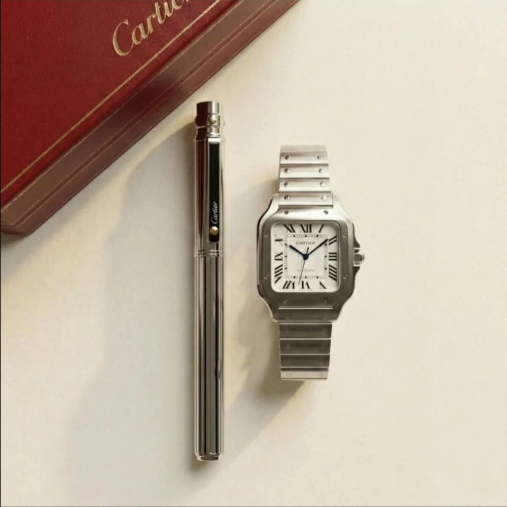 طقم هدية فاخرة ومميز ومخصص لمن تحب، يتكون من ساعة وقلم أنيق بتصميم كارتير محفور بالاسم مع علبة فاخرة بتنسيق راقٍ وكرت عبارة حسب الطلب.