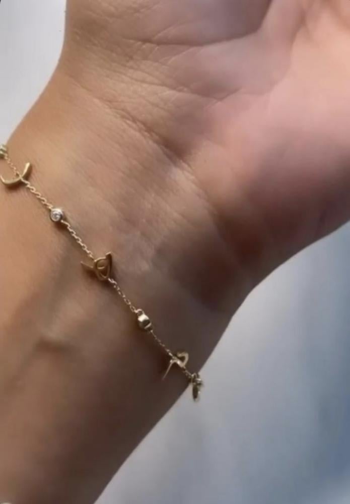 يد كلها أنوثة ونعومة مع اسواره بتصميم مميز جدا بالاسم مع الحرف مطليه بطلاء ذهب أصلي عيار 21 مع ضمان سنتين على اللون بسمك 0.7 مم وطبعا مع علبة مخصصة وكيس لتقديمها كهدية