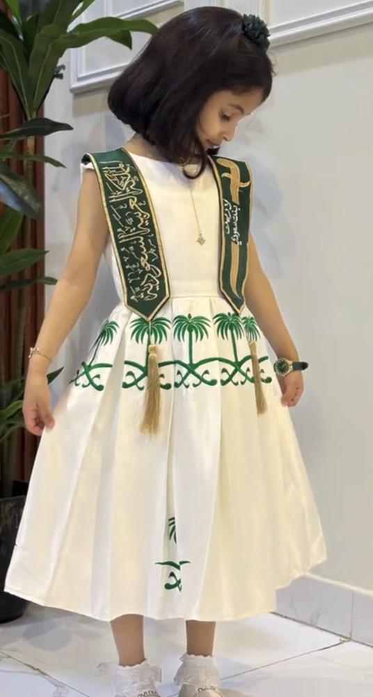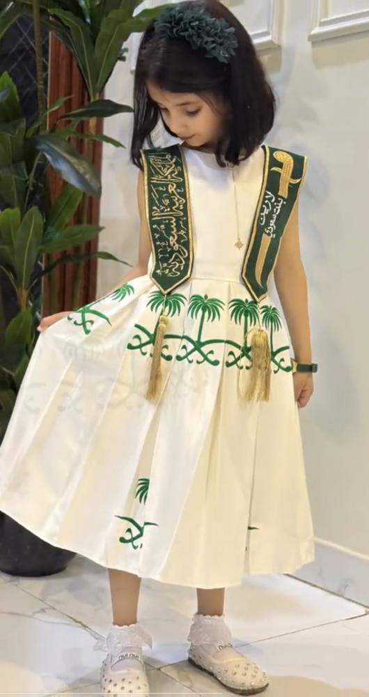 فستان أنيق باللون الأخضر، مزين بتطريز شعار المملكة العربية السعودية (السيفين والنخلة). تصميم بلا أكمام مع حزام جانبي مطرز بالاسم او بكلمات طنية، وقصة منفوشة تمنح طفلتك إطلالة مميزة في اليوم الوطني والمناسبات الخاصة.