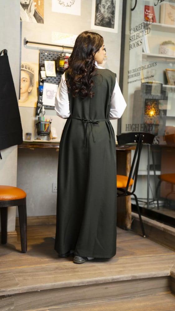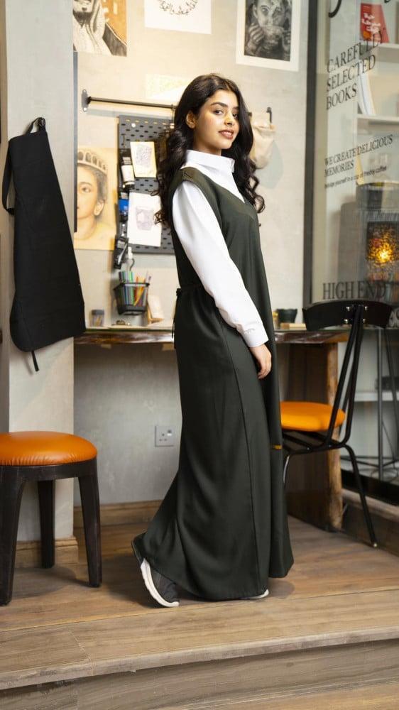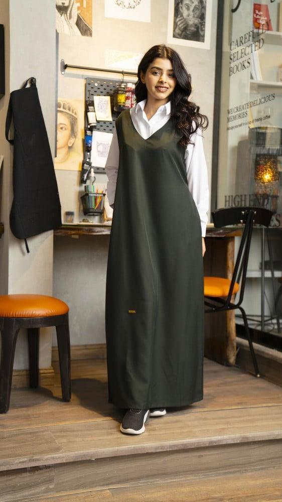 مريول متوسط بلون زيتي بقطعتين شيال بتصميم سبعه للرقبة وربطه ناعمة من الخلف مع سحاب لسهولة اللبس و مع قميص منفصل