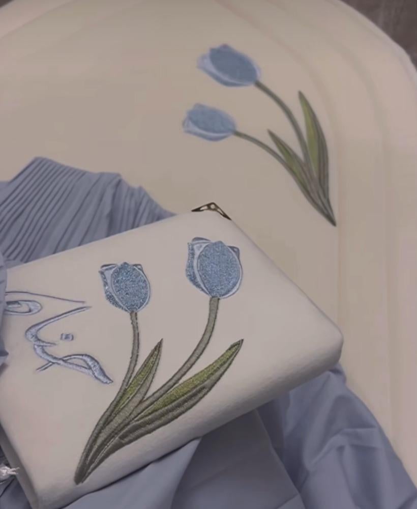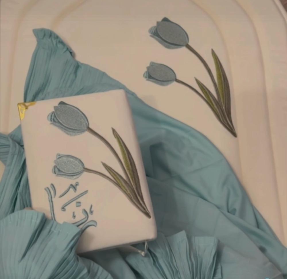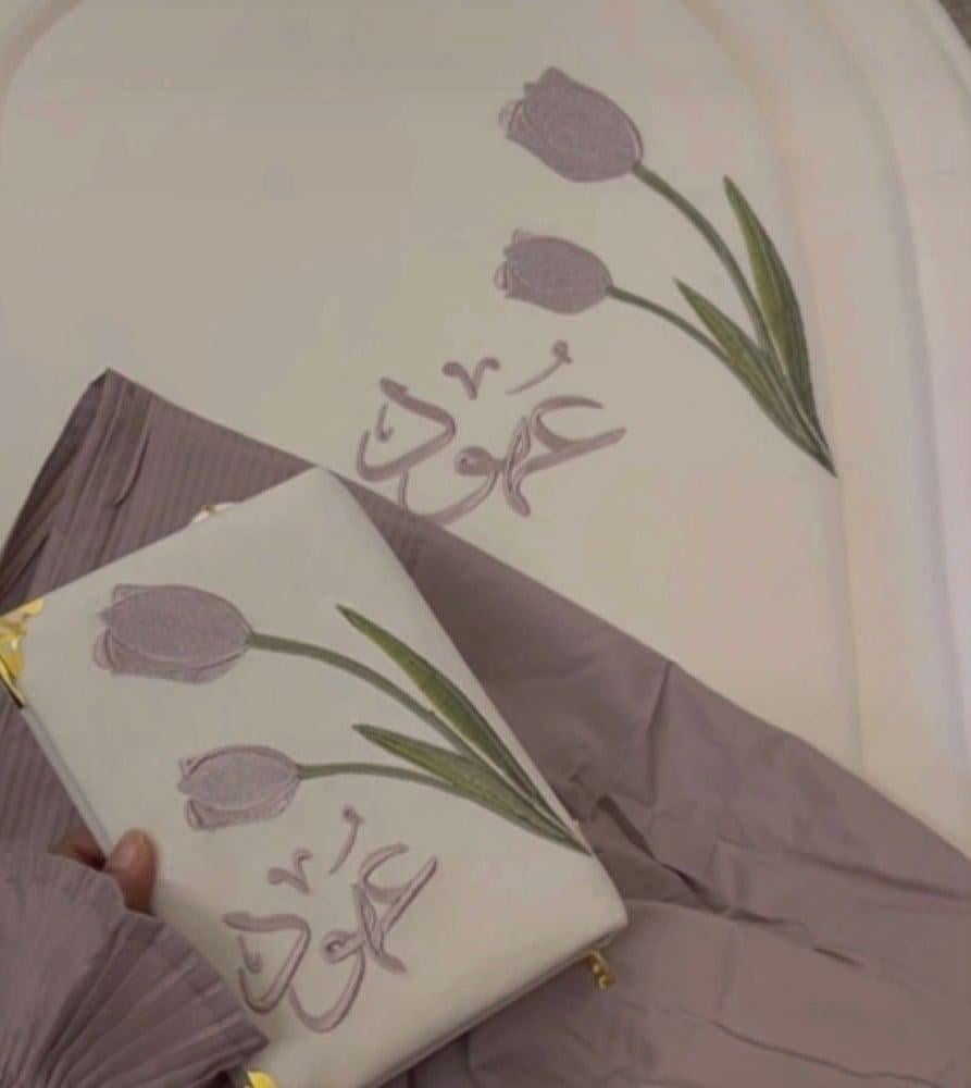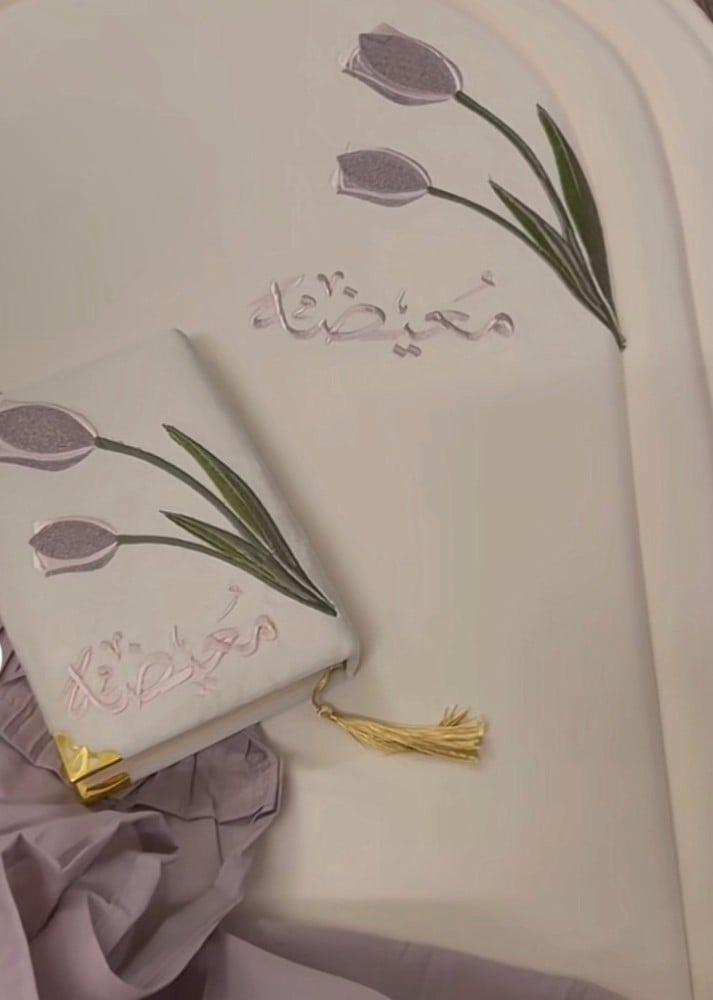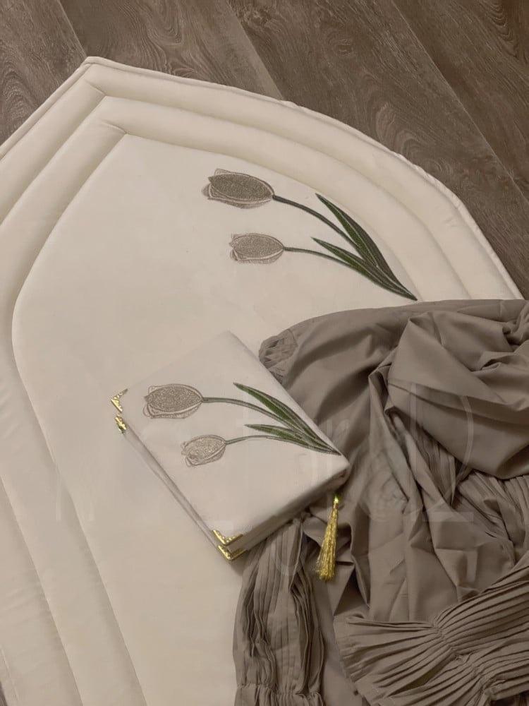 تطريز ورة التوليب بالقلتر مناسق مع شرشف صلاة باليسية ومصحف مطرن ليمنح تجرية صلاة مريحة وفاخرة أو