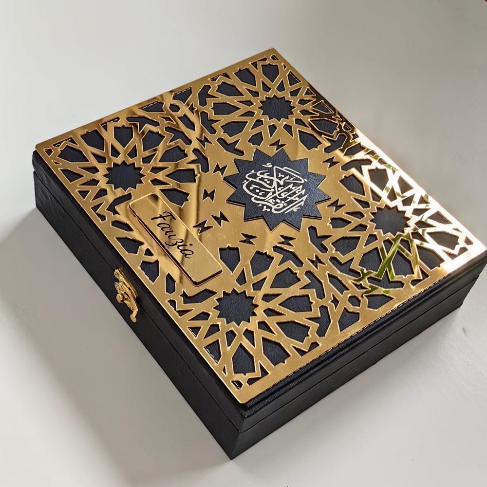 صندوق من الجلد الفاخر مع تزيينه بالاكريليك الذهبي بالزخارف الإسلامية التراثية مما يعطي فخامة لا نظير لها مع الموضع الخاص بوضع الإسم بأجمل الخطوط العربية والانجليزية مع القماش المنجد البيج من الداخل