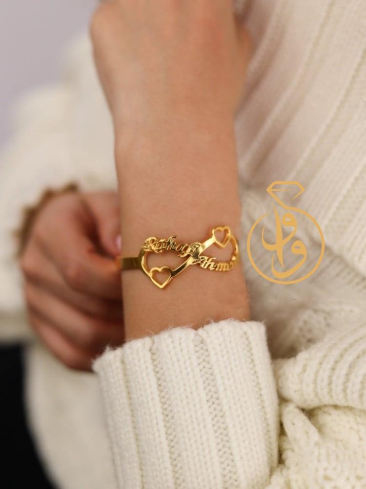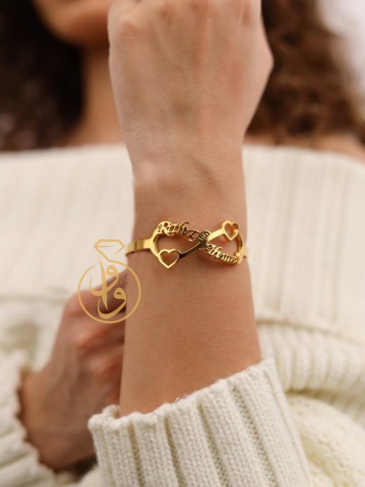أفخم وأرقى هدية نسائية نقدمها لكم اسوارة بتصميم لا نهاية مع اسمك واسم من تحب بحفر ليزر احترافي مع رسمة قلب ويمكن طلب اسوارة رافال بطلاء ذهبي أو فضي أصلي لا يصدأ