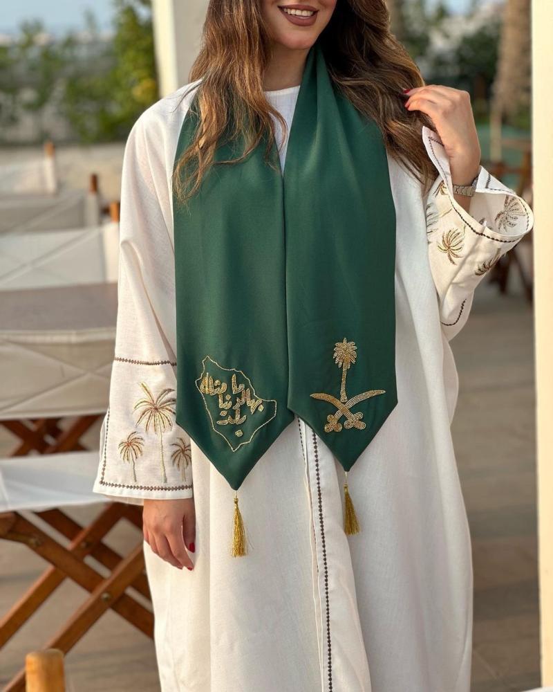 تميزوا باحتفالاتكم الوطنية وارتدوا وشاح من ملكة للاطفال والكبار لتظهروا باليوم الوطني السعودي وغيرة من المناسبات الوطنية بمظهر يليق بهذا اليوم العظيم وشاح علية نقشة تطريز بالخيط اللماع الذهبي او شك كريستال بالعبارة اللي تبيها ( حسب الطلب ) تم التصميم بعناية وحب لتحتفلوا بيوم مميز وعظيم كاليوم الوطني السعودي والتأسيس