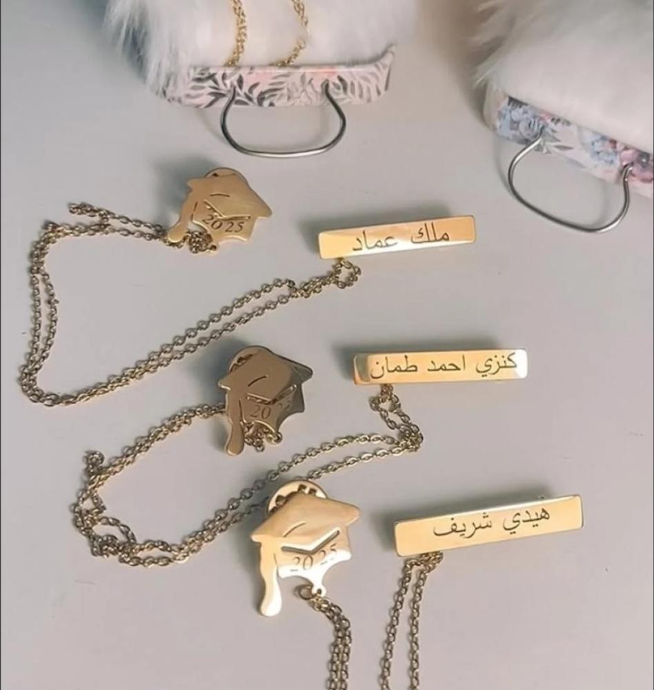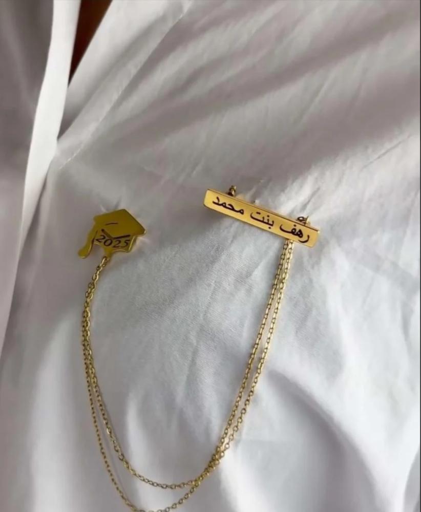 احتفلي بلحظة تخرجك المميزة مع بروش التخرج الفريد يتميز هذا البروش بتصميم أنيق وجذاب، مع اسمك محفور بدقة، ليكون تذكازا رائغا لهذا الإنجازـ يضيف لمسة من الفخر والأذناقة إلى ملابستك في يومك الكبير. اجعل تخرجك لا ينسى مع هذا البروش المميزا